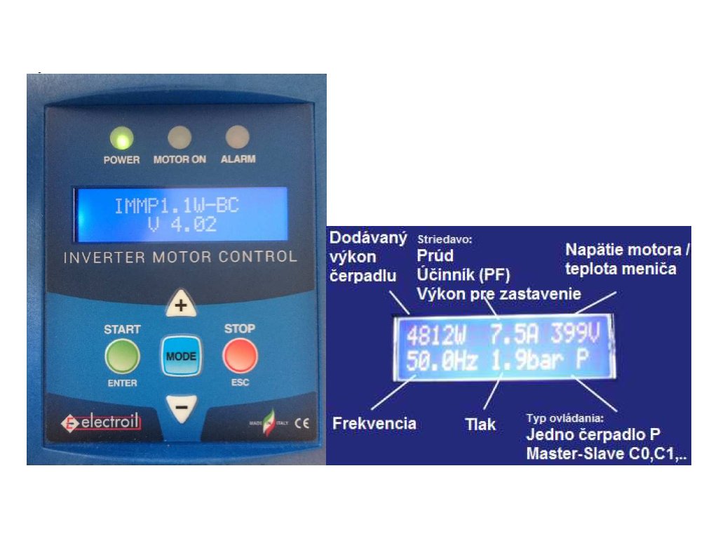 Pri prvom spustení menič vykoná automatický test parametrov čerpadla (pri ktorom musí byť zavretý ventil na výtlaku) a nastaví tlak regulácie na 3 Bary. Prúd meniča aj ochrana proti chod na sucho je prednastavená. Čerpadlo zastavíme, spustíme, tlak pridáme, uberiame jednoducho a rýchlo, kedykoľvek keď potrebujeme .