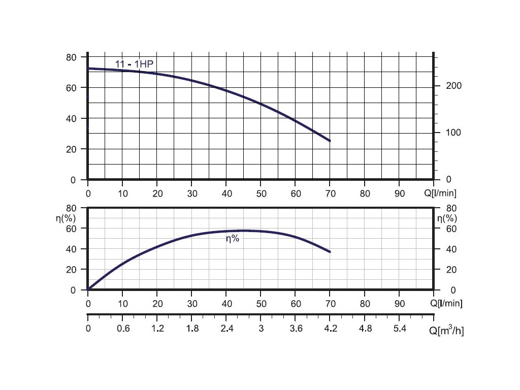 Pracovný bod Qopt.= 50l/min pri H=49m, Qmax=70l/min, Hmax=72m