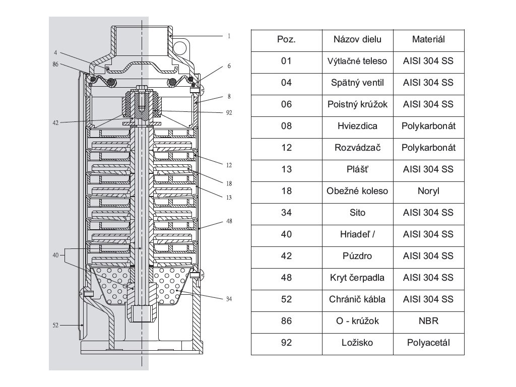Výtlačné a sacie teleso sú vyrobené z nerez ocele AISI 304, ktorá zabezpečuje špičkovú pevnosť a životnosť. Sacie teleso spĺňa normu NEMA. Obežné kolesá sú plávajúceho typu, vyrobené z materiálu NORYL. Spoločne s rozvádzačmi z polykarbonátu vystuženého sklenými vláknami zosilňujú hydrauliku čerpadla.Články obežného kolesa, spojka hriadeľa, sito, hriadeľ hydrauliky a spätná klapka sú vyrobené z nerez ocele AISI 304. Spätná klapka je osadená vo výtlačnom telese, zabraňuje spätnému prúdeniu vody a spätným rázom, ktoré by mohli poškodiť mechanické časti. Ložisko je vyrobené z polyacetátu, zabezpečuje odolnosť voči abrazívnemu opotrebeniu a korózii. Plášť čerpadla je zhotovený z hrubostenného nerezového materiálu.