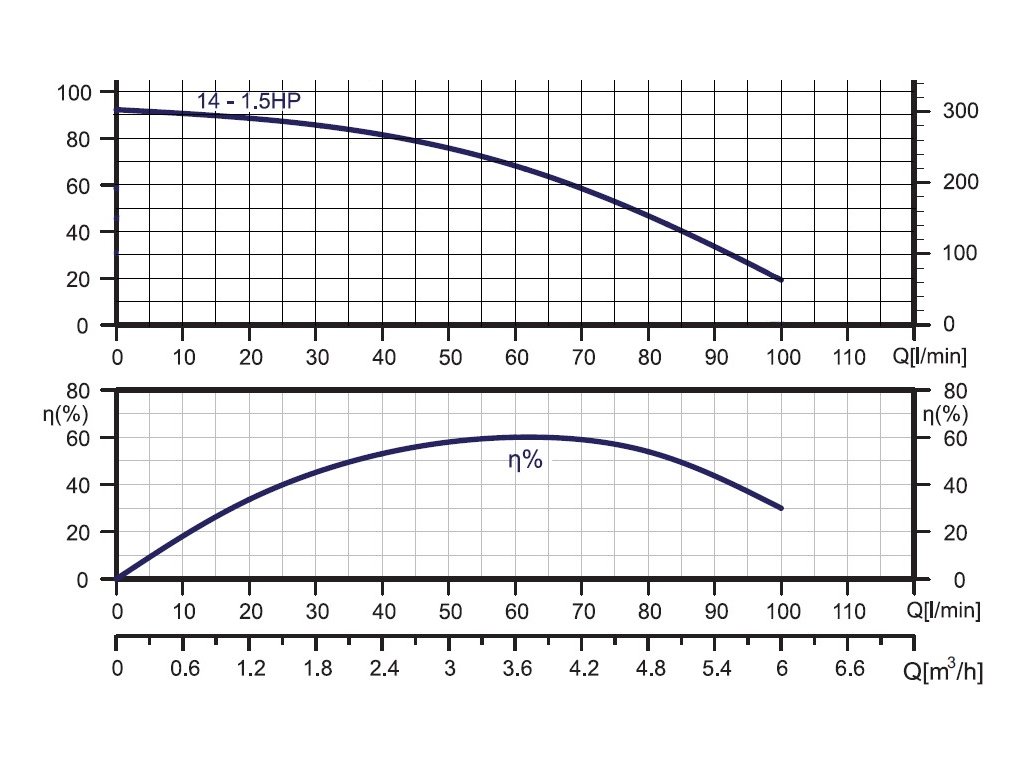 Pracovná oblasť čerpadla: H= 87-20 m, Q= 25-100 l/min. Do vrtov od Ø110 mm a viac.