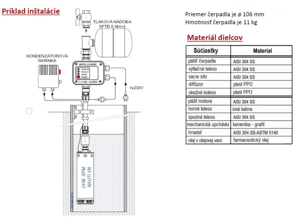 Monoblokové ponorné čerpadlo UVM 2/9F sa skladá z odstredivého viacčlánkového čerpadla a zabudovaného ponorného elektormotora. Plášť čerpadla je vyrobený z nehrdzavejúceho materiálu. Obežné kolesá sú vyrobené z oteruvzdorného plastu. Je dodávané s napájacím káblom a plavákovým spínačom. Čerpadlo je jednofázové na 220-240V / 50Hz a je vybavené kondenzátorovou skrinkou na ovládanie čerpadla.