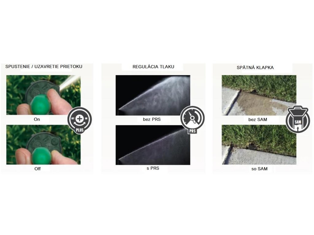 Verzia "Plus" prináša exkluzívnu technológiu Stream Control™, ktorá umožňuje jednoduché zastavenie prietoku vody priamo na hlave postrekovača pomocou skrutkovača. Táto funkcia výrazne zjednodušuje inštaláciu a údržbu, pretože umožňuje výmenu trysky alebo nastavenie postrekovača bez nutnosti odstavenia celej závlahovej sekcie. Model PC (Part-Circle) umožňuje jednoduché nastavenie výseče zhora v rozsahu od 40° do 360°, vrátane plnokruhového režimu.